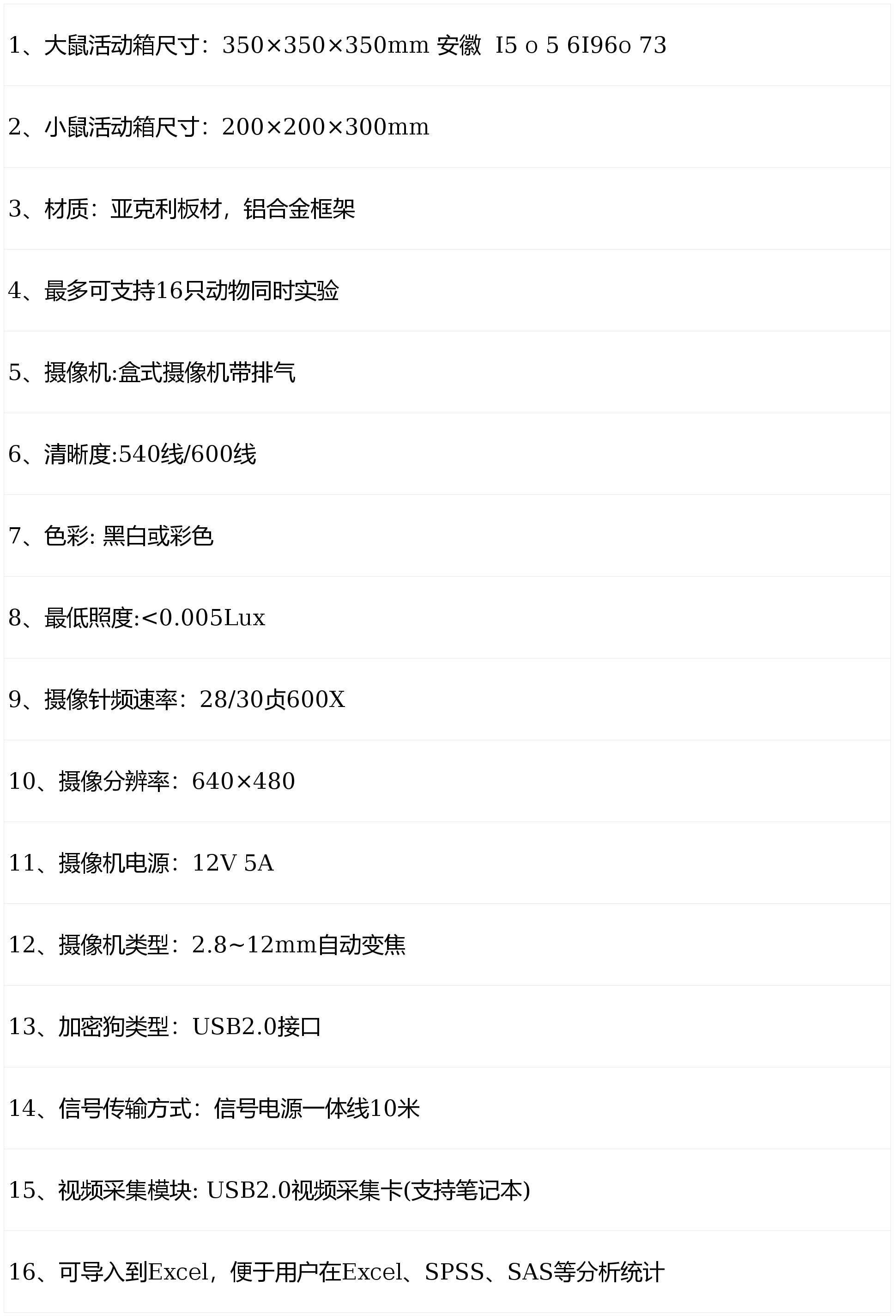 自发(开场)活动视频分析系统V3.0(inner open field test)是观察研究实验动物神经精神变化、进入开阔环境后的各种行为,例如动物对新开阔环境的恐惧而主要在周边区域活动,在中央区域活动较少,但动物的探究特性又促使其产生在中央区域活动的动机,也可观察由此而产生的焦虑心理。中枢兴奋药物可以明显增加自主的活动而减少探究行为,一定剂量的抗精神病药物可以减少探究行为而不影响自主活动。