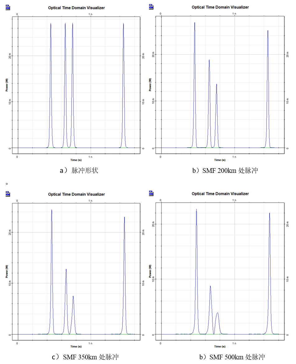 图9.显示了脉冲的初始模式,以及在SMF中传输200、350和500km后的相同脉冲模式,以及每隔50km用SOA进行周期性放大。