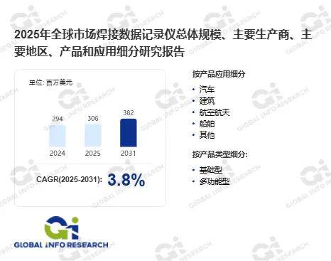 据环洋市场咨询(Global Info Research)调研团队最新报告《 2025年全球市场焊接数据记录仪总体规模、主要生产商、主要地区、产品和应用细分研究报告--环洋市场咨询(Global Info Research) 》显示,按收入计,2024年全球焊接数据记录仪收入大约294百万美元💵,预计2031年达到382百万美元💵,2025至2031期间,年复合增长率CAGR为3.8%。