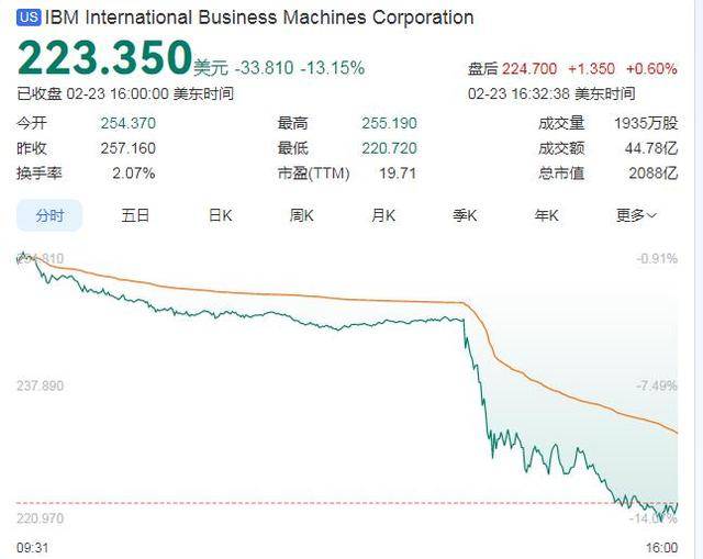 周一美股盘中,IBM股价从近4.5%的跌幅迅速扩大至两位数,成为人工智能技术飞速发展的最新“受害者”。截至收盘,IBM股价报223.35美元💵,跌幅13.15%。