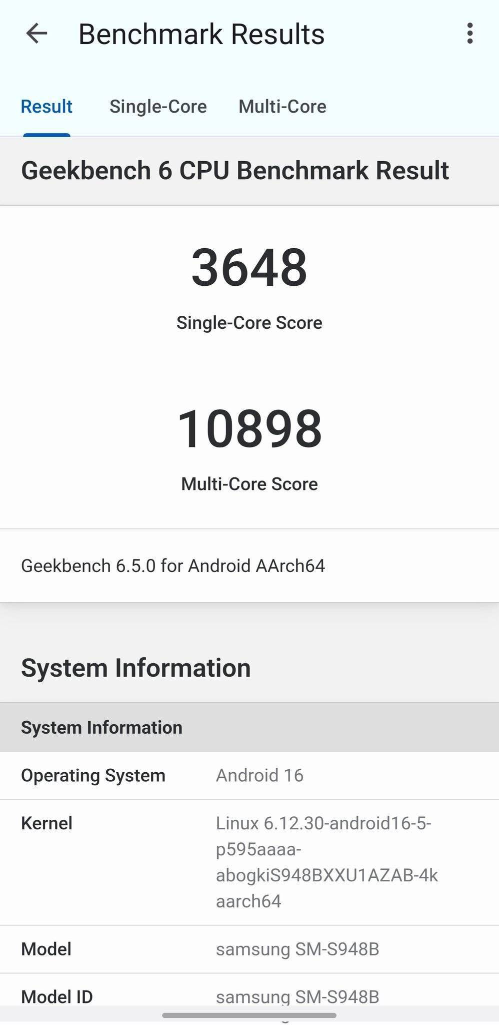 在 Geekbench 6 测试中,单核成绩为 3648 分,多核成绩达到 10989 分。