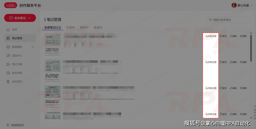 这是一款基于影刀RPA开发的"自动化调整红薯笔记可见范围的RPA『机器人』️(网页自动化)",通过红薯网页端"创作服务后台",实现笔记"隐藏&公开"的权限自动化调整。