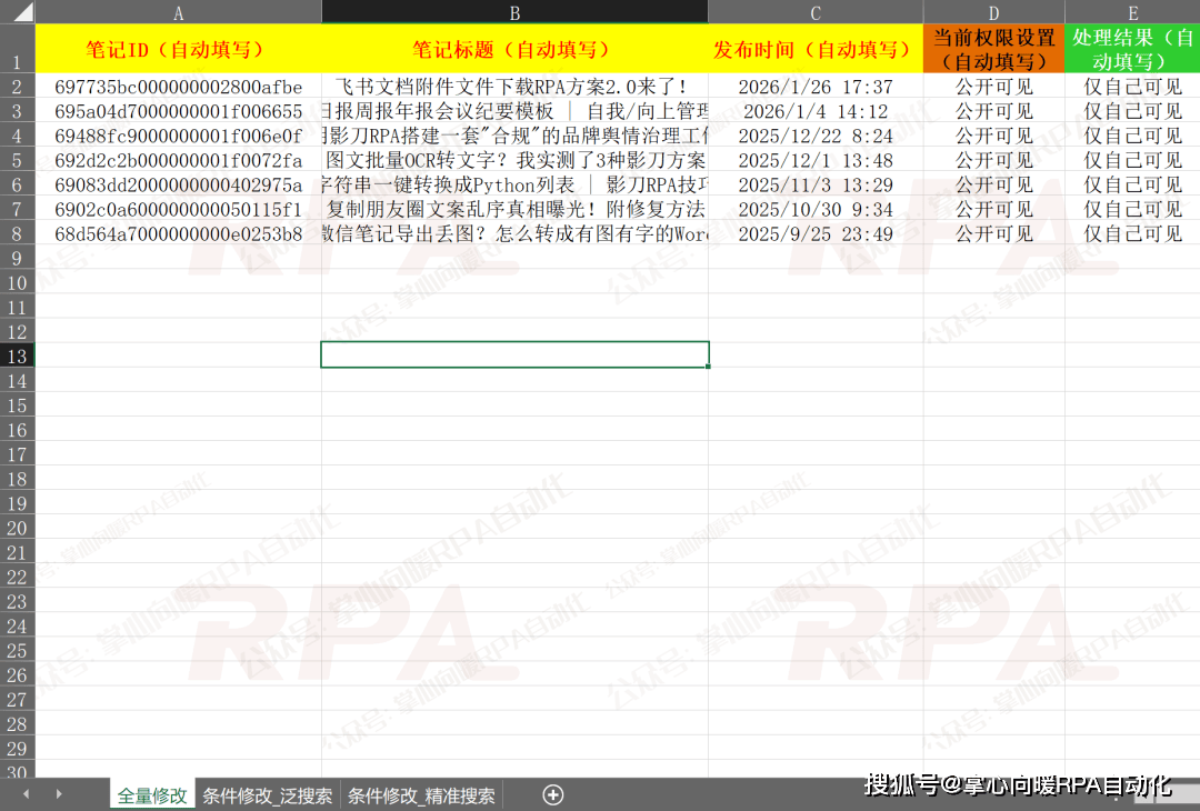 • 程序内置状态校验功能,若笔记的当前状态与目标状态一致(例如:已经是"仅自己可见"且目标也是"仅自己可见"),RPA 将自动跳过该条目,以节省运行时间。