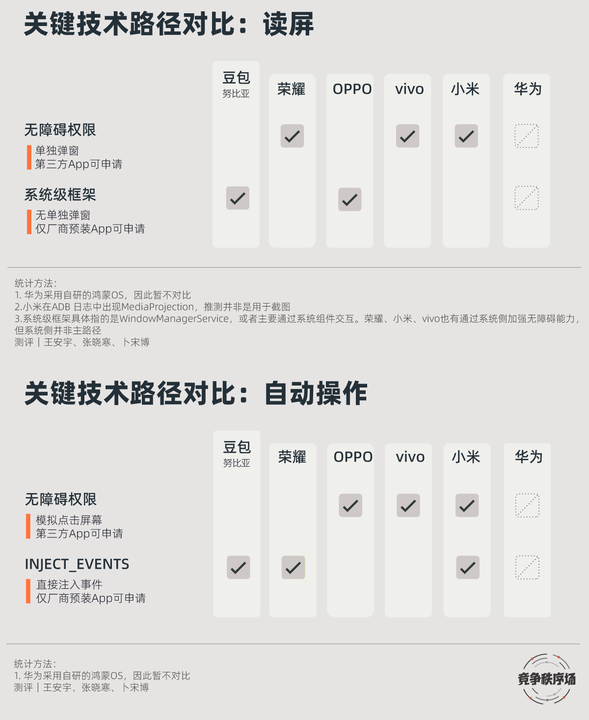 在自动操作层面,权限升级同样明显。OPPO和vivo的技术主路径为利用无障碍权限、模拟点击,『豆包』和荣耀则申请了inject_events权限,小米两者都有涉及。