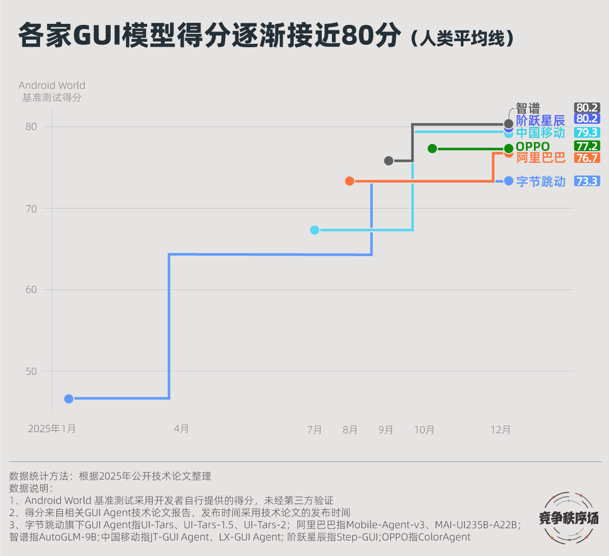 在覆盖20个『安卓』应用、116项任务的Android World基准测试中,字节得分73.7分,阿里拿到76.7分。登上该基测榜单的国内公司还有智谱、阶跃星辰和OPPO,自评分数在70分到80分之间。虽然在2025年一年里有明显提升,但还不能稳定达到人类平均水准(80分)。