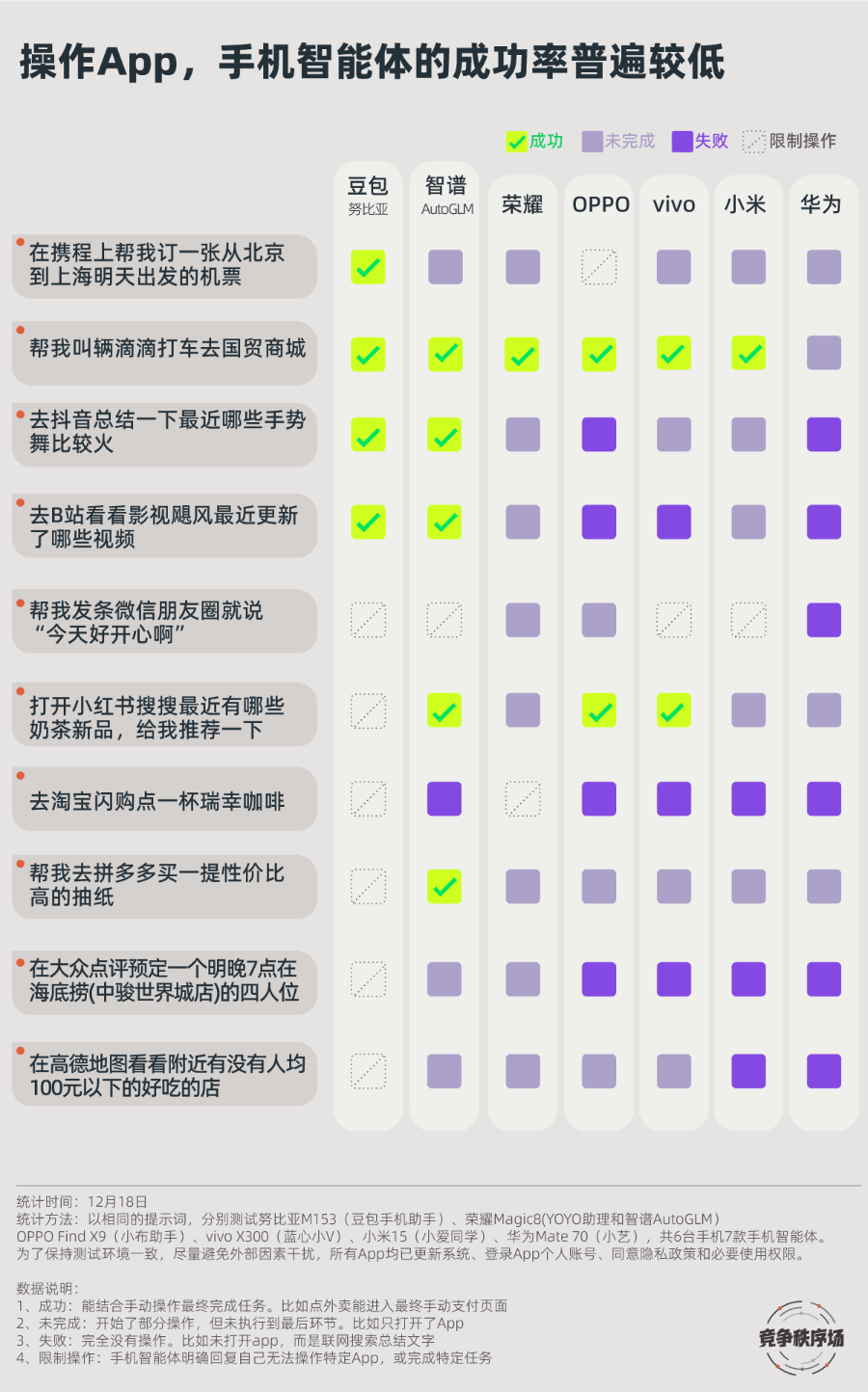 但现实情况是,手机智能体仍停留在一个吸引投资者的概念,而非能用的产品。我们在2025年3月测评了6款手机智能体,发现失败率高、不稳定、耗时长是普遍问题,只有荣耀勉强能算“半自动驾驶”。