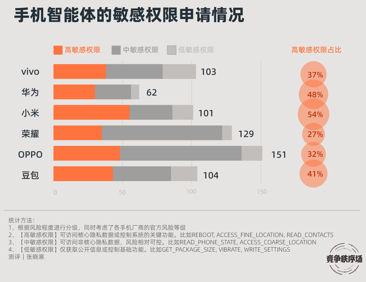 我们联合张晓寒测评了努比亚(『豆包』手机)、荣耀、华为、vivo、OPPO、小米六台手机的预装智能体,发现几乎所有智能体的权限总量都超过100个。四类权限(系统控制、屏幕控制与注入、窗口与显示管理、隐私数据访问)构成智能体接管手机的能力基石。