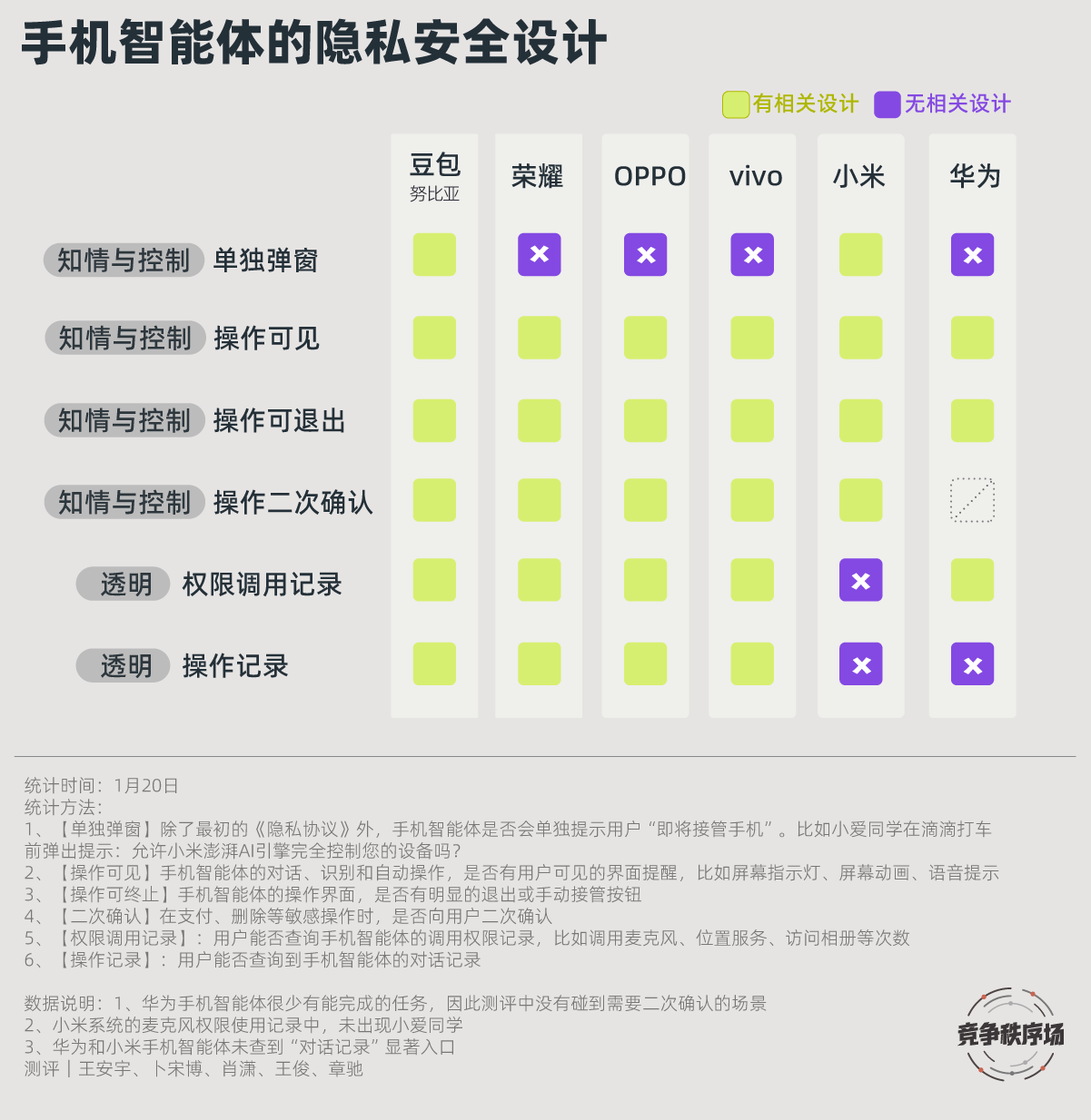 眼下,这些问题成了更严肃的堵点。我们为此新一轮测评了『豆包』手机助手、智谱、荣耀、华为、小米、OPPO、vivo七款手机智能体,追踪它们的性能、底层模型、系统权限、隐私设计最新情况,并梳理水面之下的厂商博弈。