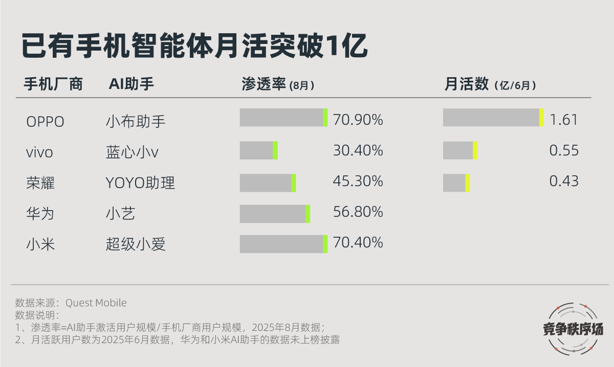 OPPO、vivo、荣耀是其中最积极的发力者。根据Quest Mobile数据,OPPO小布助手在2025年6月已经拥有1.6亿月活用户,vivo蓝心小v为5500万,荣耀YOYO助理为4200万,三者跻身上半年增速最快的AI应用行列。