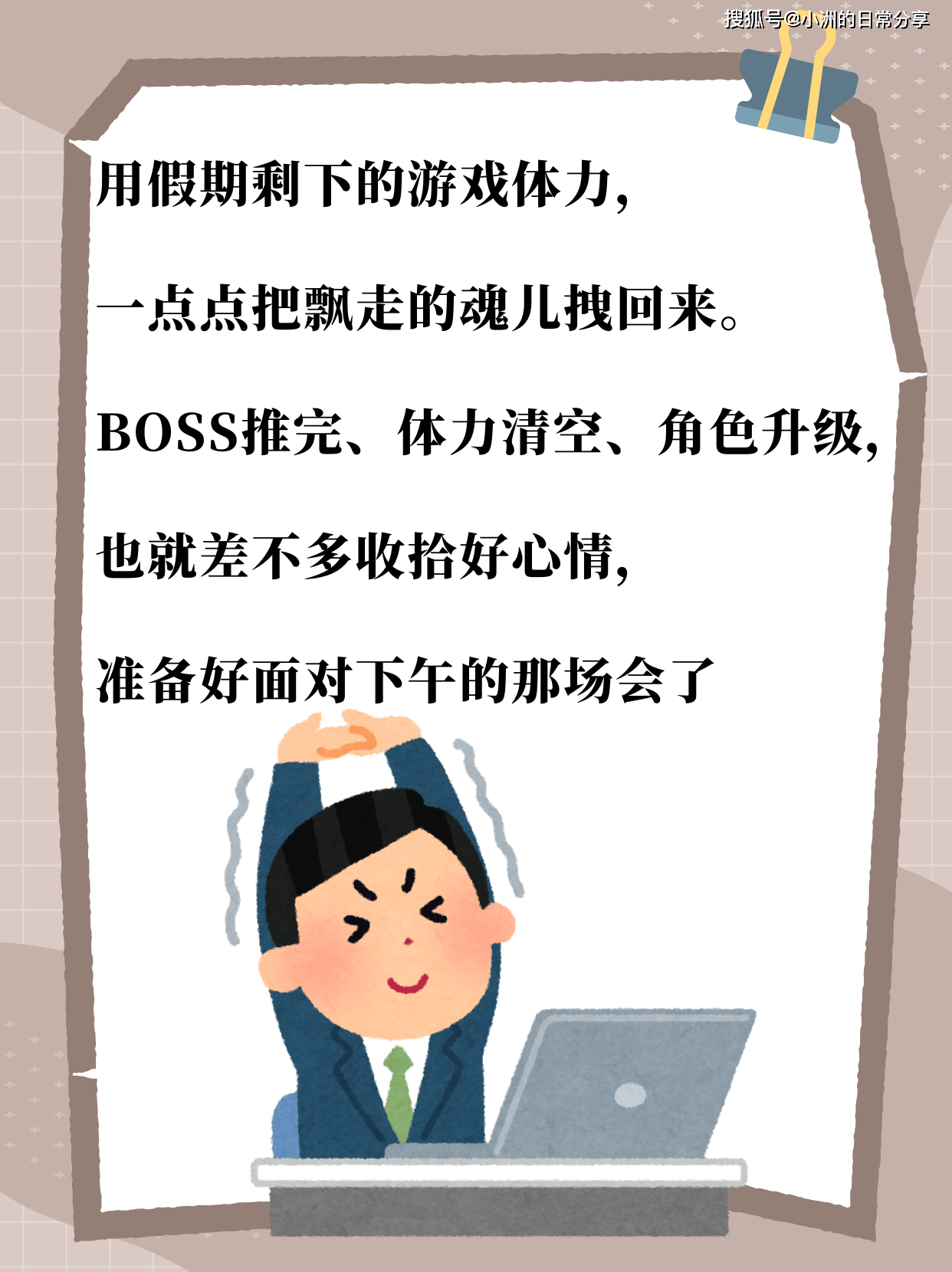 把手机屏幕亮度调到最低,开启我的“节后职场适应性康复训练“,用假期剩下的游戏体力,一点点把飘走的魂儿拽回来。等BOSS推完、体力清空、角色升完级,也就差不多收拾好心情,准备好面对下午的那场会了。