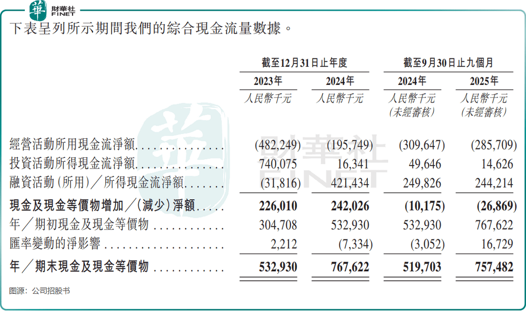 高速扩张背后,海柔创新面临着不容忽视的资金压力。公司经营活动现金流持续净流出,2023年、2024年及2025年前三季分别净流出4.82亿元、1.96亿元及2.86亿元,尽管2024年流出规模有所收窄,但2025年前三季又有所扩大。
