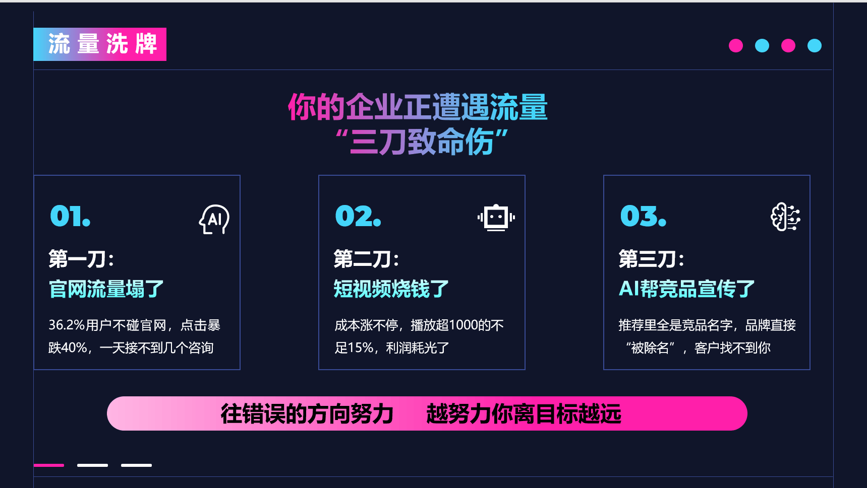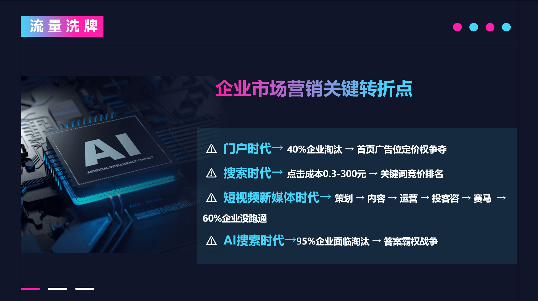 高性价比之选在价格方面,必突壁科技的AI大模型搜索营销服务具有极高的性价比。传统营销模式中,60%的厂商依赖电销、线下拜访等模式,效率低下,而20%的传统厂商通过投流竞价等模式,营销成本占比过高,利润压缩至5%以下甚至更低。相比之下,必突壁科技的服务能让客户通过传统营销模式和AI大模型搜索营销的成本对比,节省90%的营销费用,增加80%以上的曝光率,且客户转化率比SEO或投流客户更精准,信任感更强。同时,其全链路闭环的服务模式比传统渠道引流 + 锁客增加了30%以上的转化率。