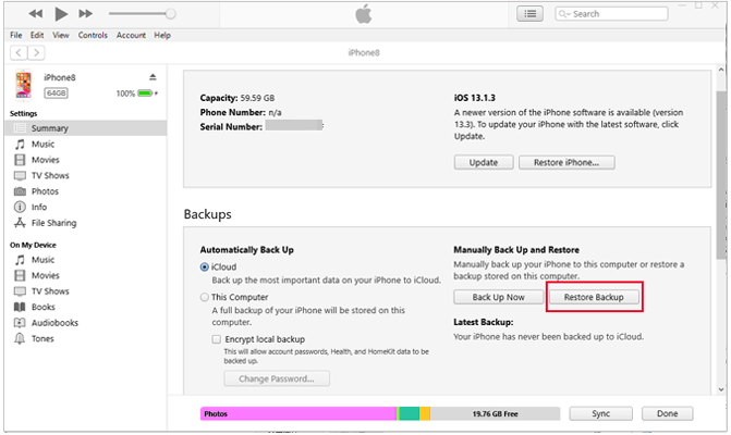 当然,如果您之前做过备份,您也可以从 iTunes 备份中检索已删除的 iPhone WhatsApp 消息。如何从 iTunes 备份恢复 iPhone 上已删除的 WhatsApp 消息?步骤是这样的: