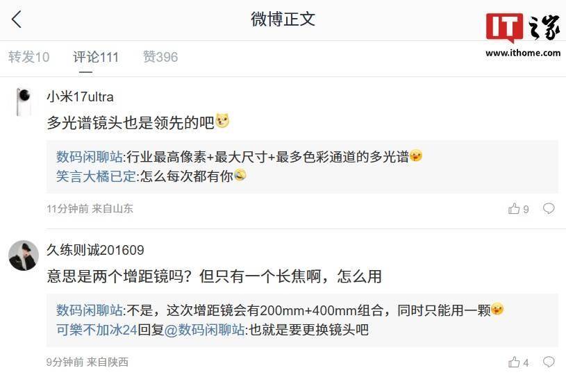 有网友询问新机的多光谱镜头是否领先?博主回复称:“行业最高像素 + 最大尺寸 + 最多色彩通道的多光谱。”还有网友询问新机是否会搭载两个增距镜?博主表示:“不是,这次增距镜会有 200mm + 400mm 组合,同时只能用一颗。”
