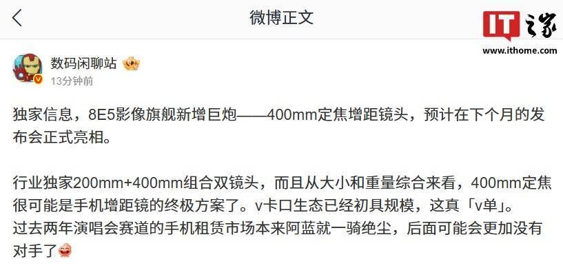 今日霍州 2 月 25 日消息,博主 @数码闲聊站 今日再曝光一款新机配件信息:蓝厂『骁龙』 8E5 影像旗舰将新增巨炮 —— 400mm 定焦增距镜头,预计在下个月的发布会正式亮相。