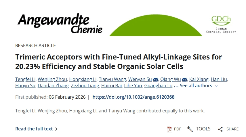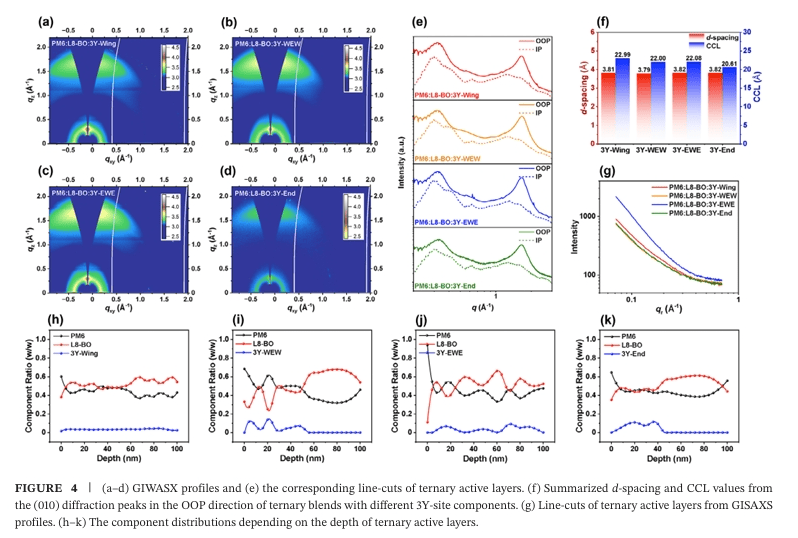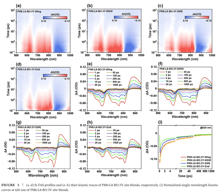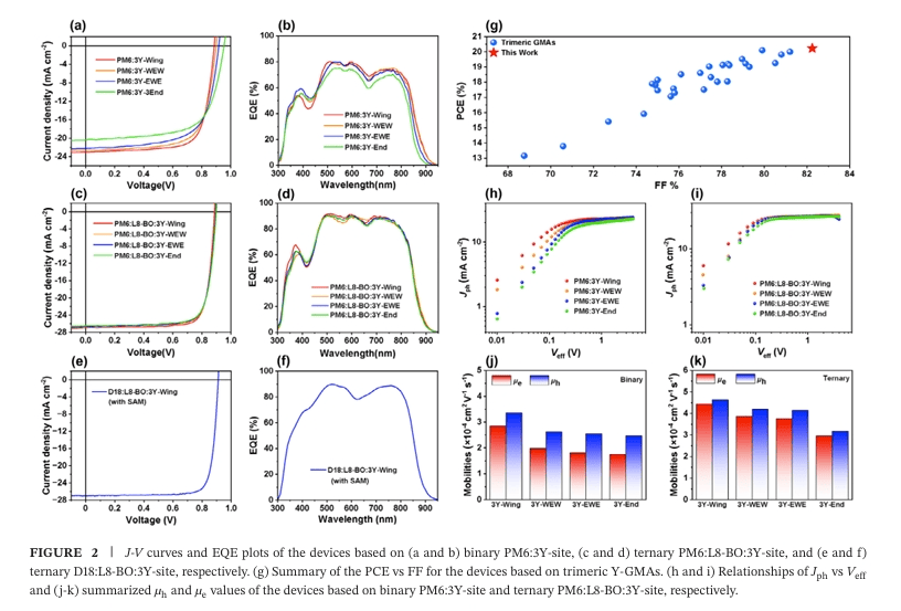 此外,在经典D18:L8-BO体系中,3Y-Wing对光伏性能的提升作用得到进一步验证,基于该体系制备的三元器件,其光电转换效率进一步提升至20.23%。这一效率值不仅创下已报道三聚体型大分子受体基有机太阳能电池的效率纪录,更跻身目前已报道的三聚体型Y系列大分子受体及非全共轭Y系列大分子受体基器件的最高效率行列。上述研究结果表明,凡群平、马伟等人开发的翼位连接型三聚体3Y-Wing,可在高光电转换效率与优异稳定性之间实现更优平衡,是实现有机太阳能电池高效与稳定双重目标的极具潜力的受体材料。