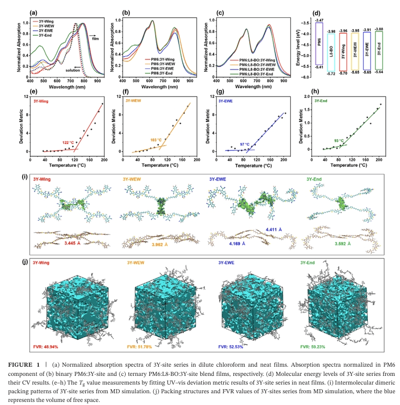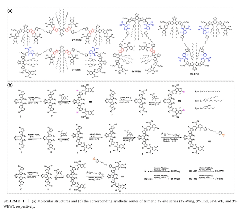 大分子受体(GMA)已被证实可有效提升有机太阳能电池(OSC)的光电转换效率(PCE)与器件稳定性,但目前多数高性能大分子受体仅连接两个单体单元,其性能主要受单体前驱体本征特性的主导。西安交通大学凡群平、马伟、Qiang Wu与湘潭大学Manjun Xiao、西安科技大学宿文燕等人设计合成了四款非全共轭三聚体型Y系列大分子受体(命名为3Y系列),包括翼位同源连接的3Y-Wing、端位同源连接的3Y-End,以及翼/端位杂化连接的3Y-EWE和3Y-WEW;该系列受体采用相同的烷基化连接链,仅通过调控单体连接位点,即可实现分子光电特性的精细调控。
