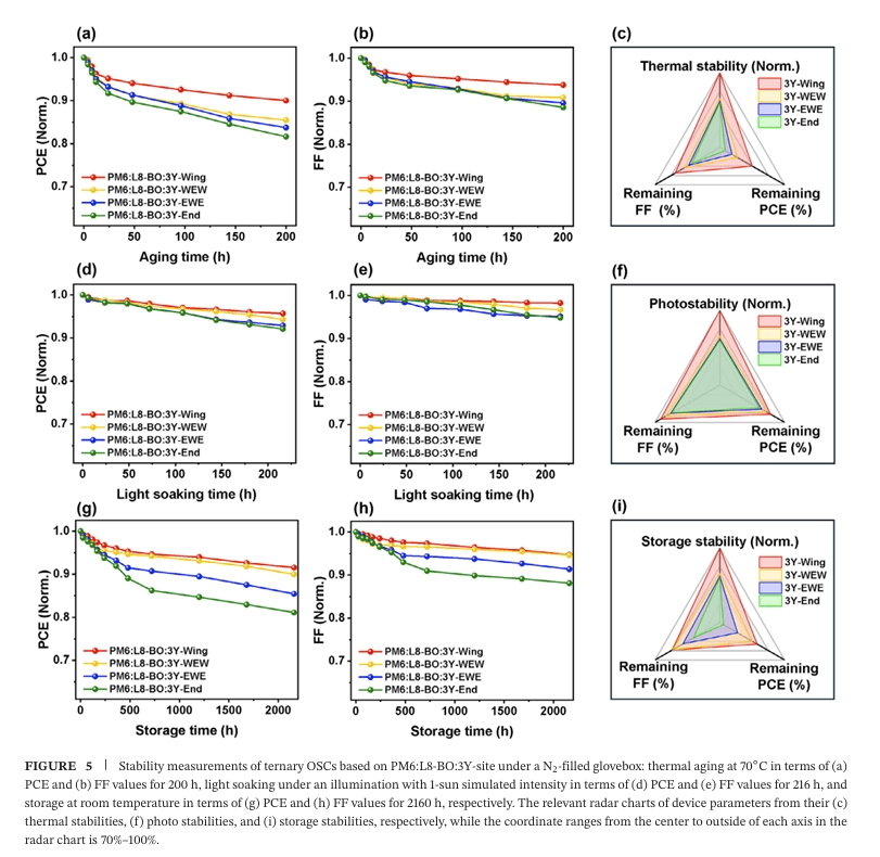 其中,3Y-Wing展现出更优异的分子构象与光电特性,兼具出色的分子平面性、延展性、光吸收性能、结晶性、分子堆积特性及玻璃化转变温度,最终实现了活性层相分离的精准优化。基于此,以PM6:3Y-Wing为给受体系的二元有机太阳能电池、以PM6:L8-BO:3Y-Wing为体系的三元器件,分别实现了15.0%和19.1%的光电转换效率,且器件的热稳定性、光稳定性与储存稳定性均得到显著提升,性能优于同系列其他3Y位点受体所制备的器件。