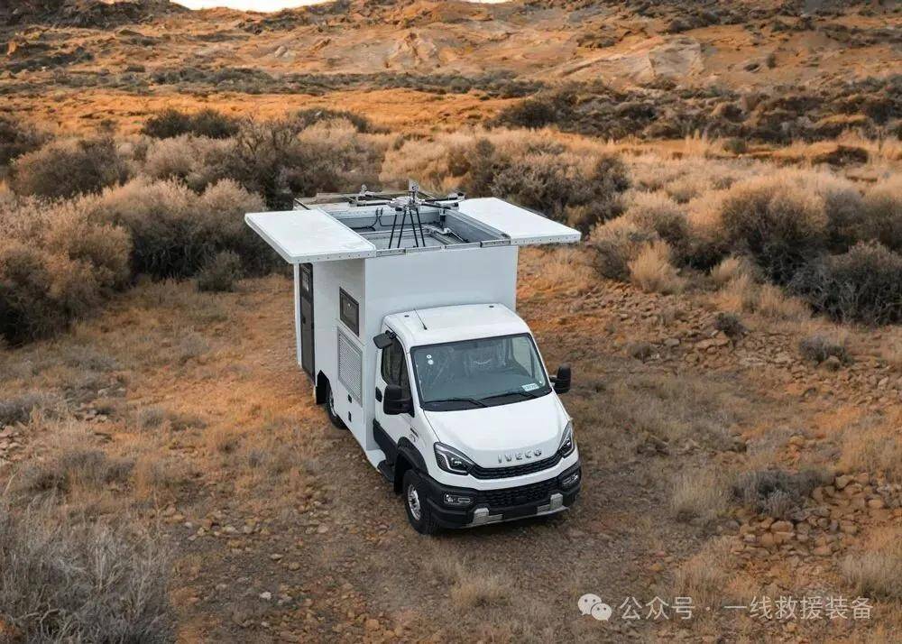 - 基于依维柯欧霸全时四驱底盘深度改装,配备 8AT 自动变速箱、3 把差速锁及 AT 全地形越野胎,最大爬坡度60%、涉水深度500mm,山地、泥泞、涉水等复杂路况轻松突破。
