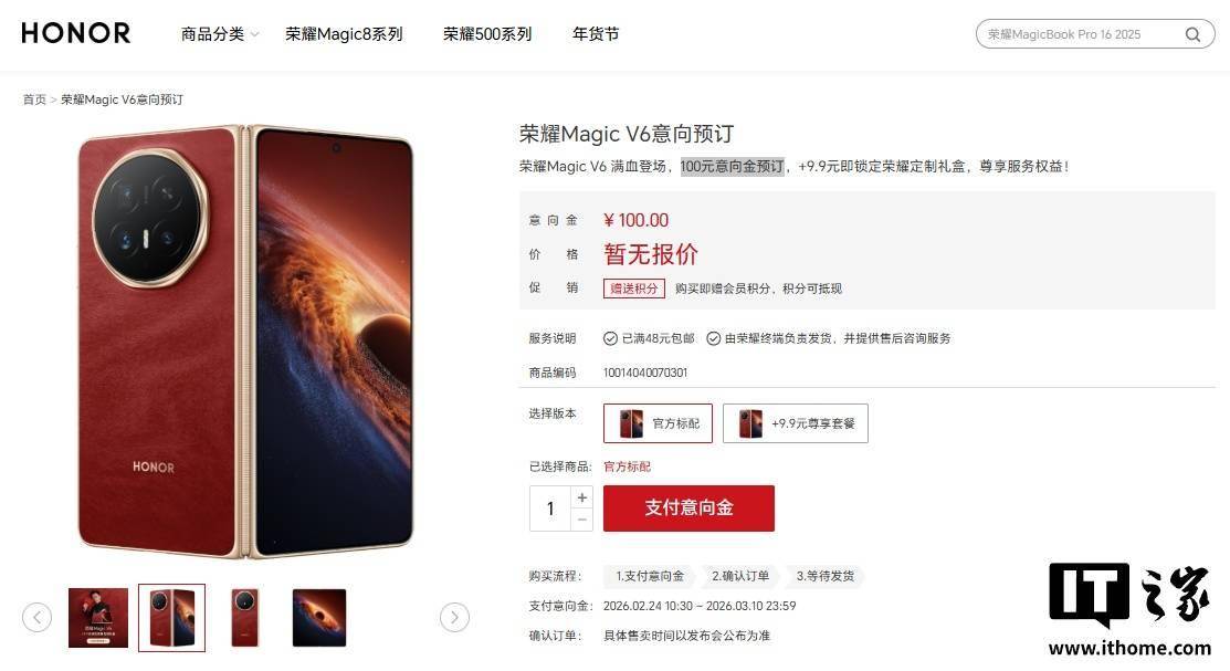 今日霍州注意到,荣耀 Magic V6 『折叠屏手机』已现身官网,公开了「赤兔红」配色不同视角的外观,并已开启 100 元意向金预订。