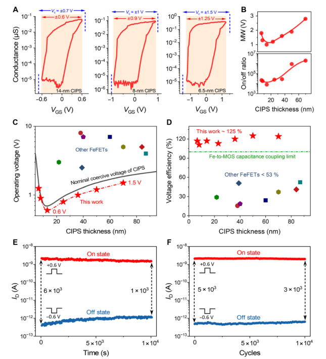 极薄铁电层结合纳米栅极使得操作电压大幅低于常规矫顽电压效率打破理论极限并展现出优秀的长期数据保持与循环读写能力。