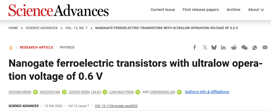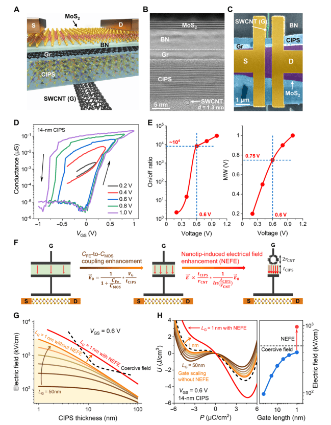 北京大学邱晨光与彭练矛团队利用单壁碳纳米管作为极小尺寸栅极研制出可在0.6V超低电压下工作的铁电晶体管。