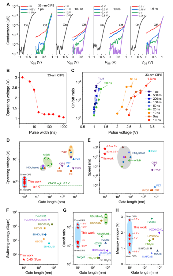 纳米栅铁电晶体管操作速度及与国际主流器件的基准对比显示:器件在1.6纳秒的超短脉冲下仍能完成读写工作电压降至所有现有场效应管存储器最低值且功耗遥遥领先同类器件。