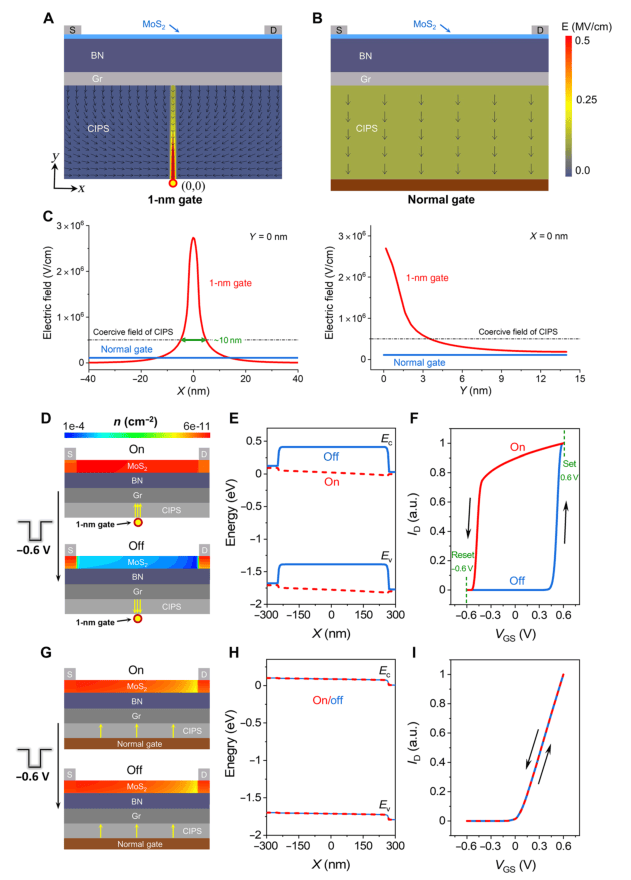 一纳米栅极晶体管在零点六伏偏置下铁电层内部形成了高度局域化的强电场。相比之下传统平板栅极晶体管在相同电压下产生的电场十分微弱且均匀根本无法完成数据的写入。