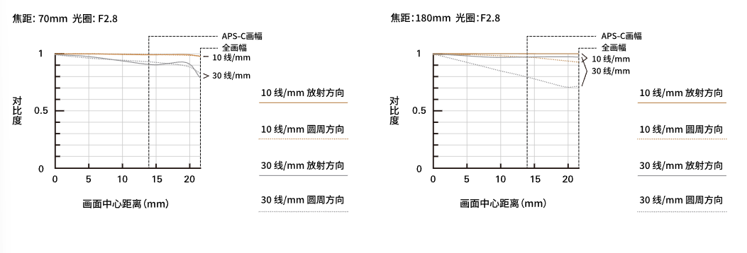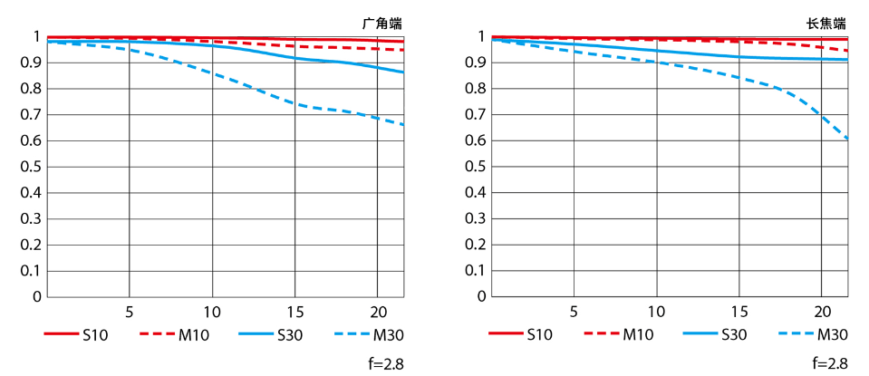 最后看看MTF曲线,广角端和长焦端表现都十分出色,尤其中心点,都到了接近1的位置。