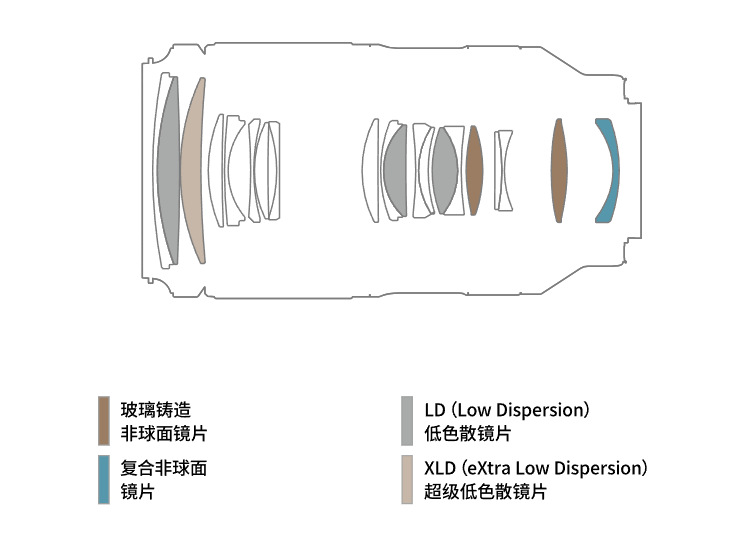 产品有15组20片镜片,有低色散镜片,超低色散镜片,以及两个非球面镜片。