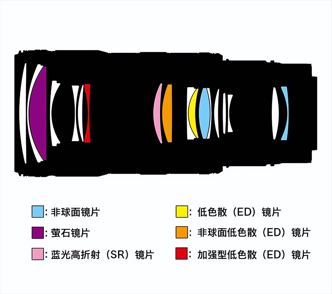 镜片有16组18片 ,含1枚低色散ED镜片,1枚加强型低色散ED镜片,2枚非球面镜片,1枚非球面低色散ED镜片,1枚萤石镜片,1枚蓝光高折射SR镜片。涂层方面,具备中孔非晶态涂层,抗反射高清ARNEO涂层,以及氟涂层前镜片。