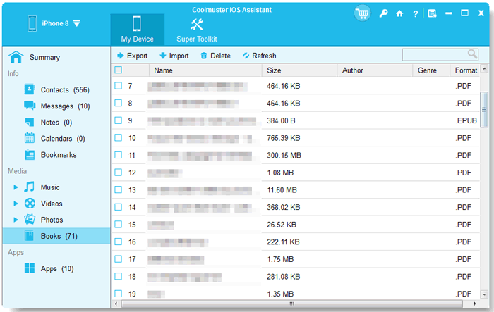 Coolmuster iOS Assistant就是这样一款工具,它可以帮助您轻松快速地将所有 iPhone 图书以原始质量导出到计算机,而无需 iTunes。此外,您还可以直接在电脑上直接导入/导出/删除iPhone上的书籍。