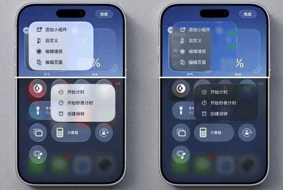 1、桌面编辑界面:长按桌面进入图标编辑模式时,菜单的透明折射效果变得更加细腻。