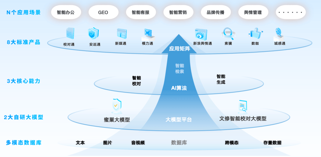 2026年蜜度推出校对通,针对出版、政务等对文本准确性要求高的行业,提供多模态内容校对服务,2023年7月发布国内首个智能校对领域垂直大模型文修,如今已迭代至V4.0版。