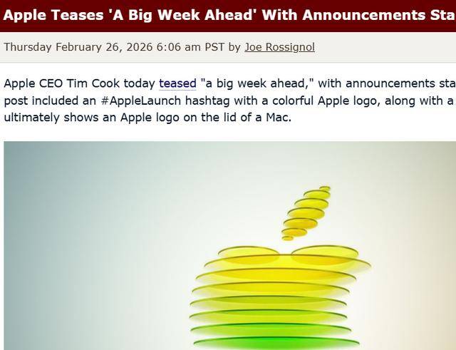 【环球网科技综合报道】2月27日消息,据外媒MacRumors报道,苹果CEO蒂姆·库克日前发布预告,称“未来一周将是重磅时刻”,新品发布活动将于3月2日正式启动。其发文附带#AppleLaunch话题标签与彩色苹果Logo,搭配的短视频最终定格在Mac机身的苹果标志上,暗示Mac系列新品将同步登场。