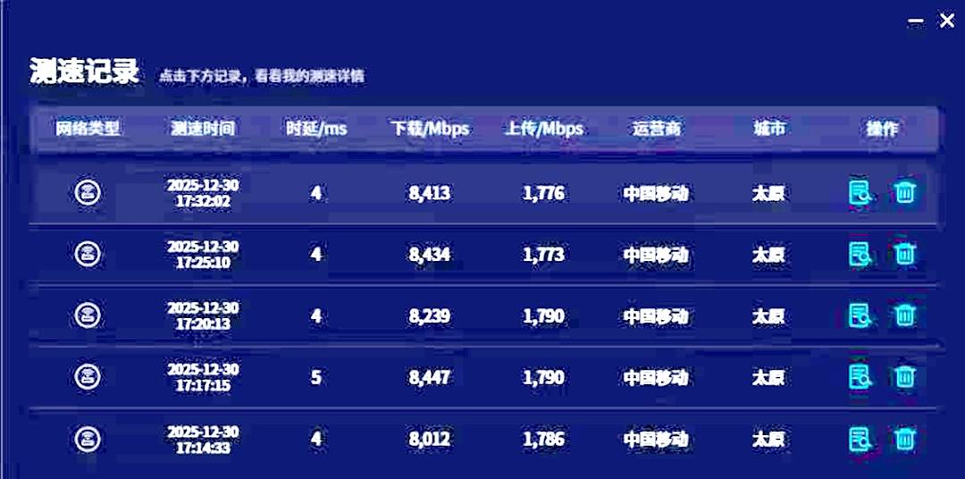 数智流量园通信基础设施项目总投资450万元,园区4.7万平方米万兆网络全覆盖,从施工到开通交付不到1个月时间。为确保万兆网络稳定落地、性能全面达标,太原移动组建专项技术攻坚团队,提前进驻园区完成全流程网络割接,并开展多轮现场实测验证。现场多轮切换不同测速节点的实测结果显示,园区网络下载速率稳定超8Gbps,上传速率稳定超1Gbps,远超工信部规定的50GPON万兆网络行业标准,充分验证了本次部署网络的超强性能与运行稳定性。技术团队后续还将持续优化网络配置,迭代升级服务能力,为园区入驻企业提供定制化、高标准的全周期网络服务。