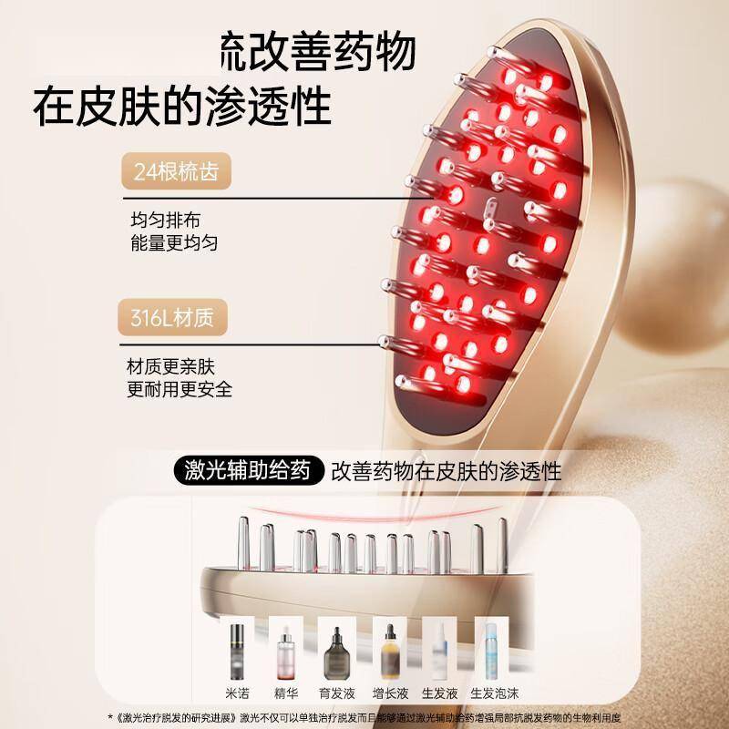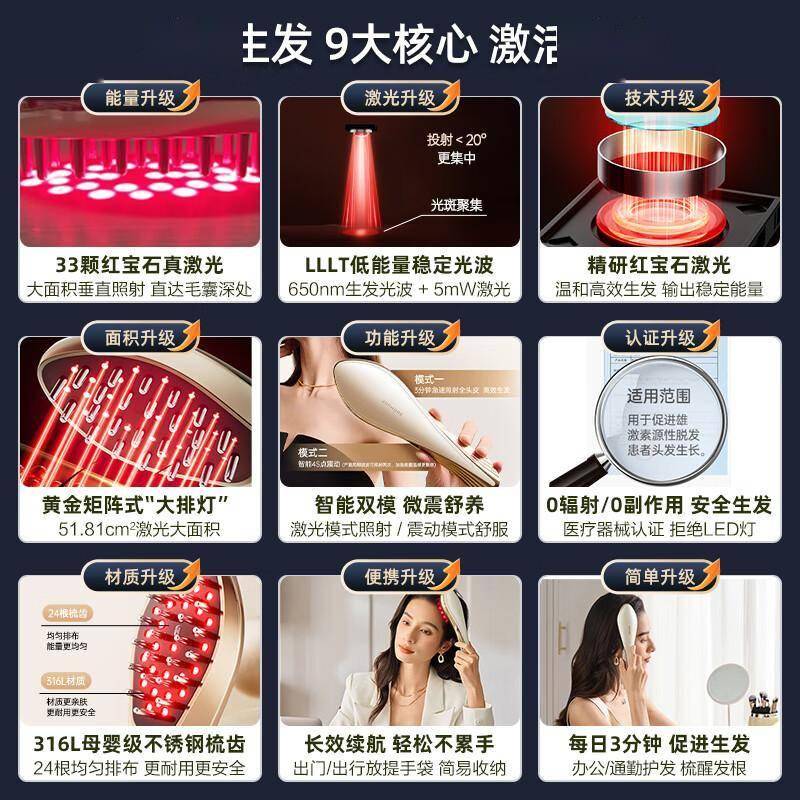 这款生发仪采用低能量激光疗法(LLLT)技术,通过650nm红光深入毛囊,刺激细胞活性,促进头发生长。与普通生发梳不同,它不需要任何药物辅助,完全依靠物理疗法实现生发效果,避免了化学药物可能带来的副作用。38颗红宝石激光头均匀分布在梳齿间,确保每次梳理都能覆盖大面积头皮区域。