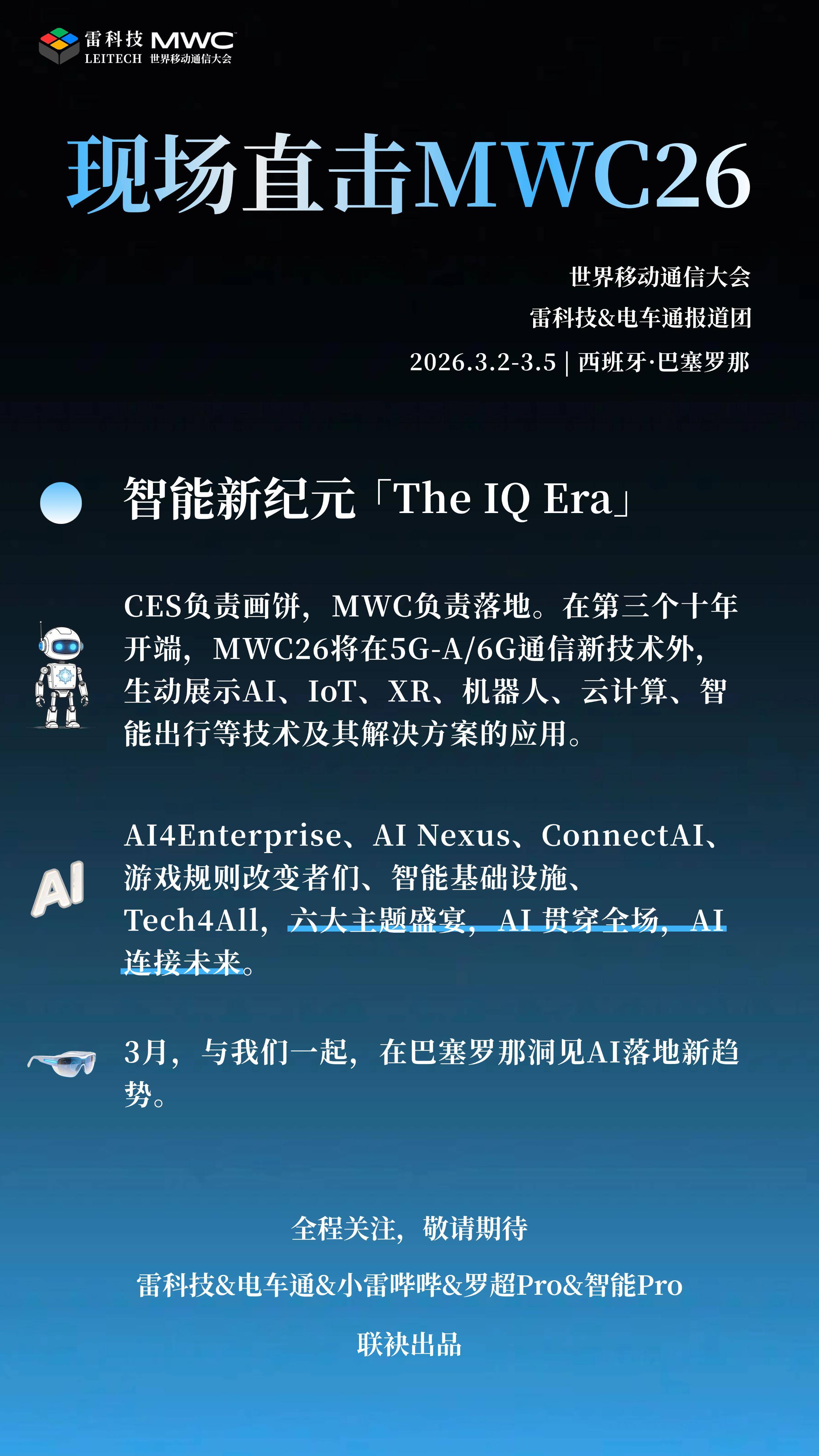 由编辑“定西”和主播“阿雷”领衔的雷科技MWC26报道团已集结完毕,将于2月27日启程飞赴巴塞罗那。 MWC(世界移动通信大会)26主题是智能新纪元「The IQ Era」,将在5G-A/6G通信新技术外,生动展示AI、IoT、XR、『机器人』️、云计算、智能出行等技术及其解决方案的应用。 AI4Enterprise、AI Nexus、ConnectAI、游戏规则改变者们、智能基础设施、Tech4All,六大主题盛宴,AI贯穿全场、连接未来。 3月,与雷科技报道团一起,在巴塞罗那洞见AI落地新趋势。