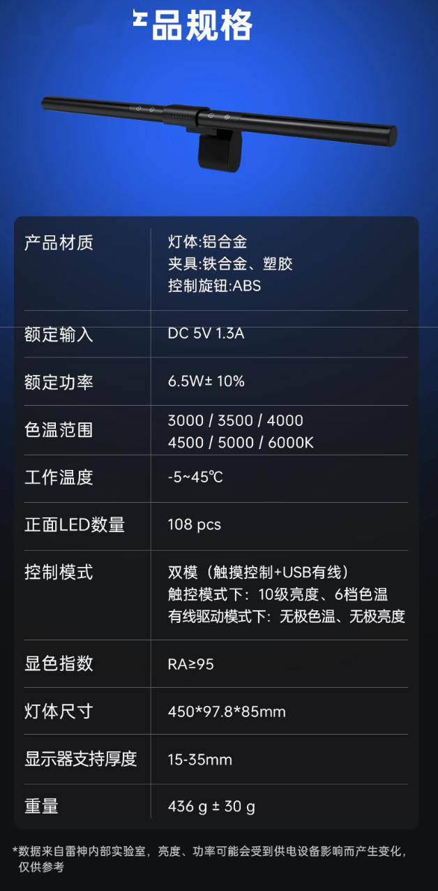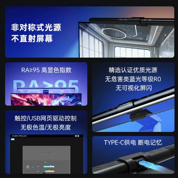 据介绍,这款屏幕挂灯采用 108 颗灯珠非对称光源,支持 10 档亮度调节(驱动无级)、6 档色温调节(驱动无级)(色温覆盖 3000-6000K),显色指数 Ra 大于 95,号称可实现“无可视化屏闪”。其他方面,该挂灯支持断电记忆,支持 USB 网页驱动控制。