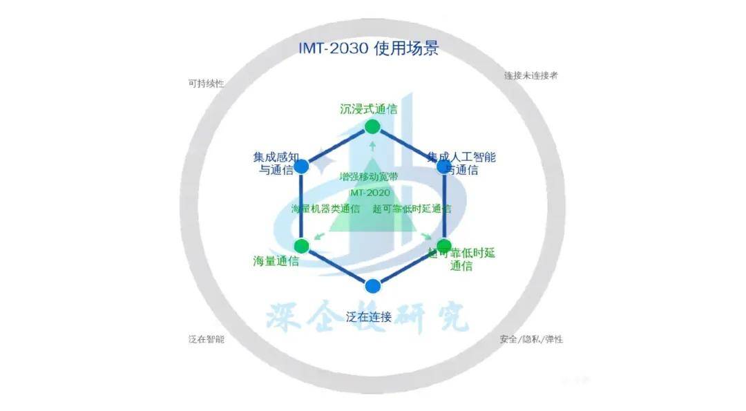在典型场景方面,6G典型应用场景在5G三大场景(增强移动宽带、海量机器类通信、超高可靠低时延通信)基础上进行了增强与拓展,包含沉浸式通信、超大规模连接、超高可靠低时延、人工智能与通信的融合、感知与通信的融合、泛在连接等六大场景。