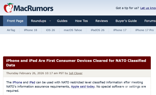 【CNMO科技消息】2月27日,苹果宣布iPhone和iPad是首款也是目前唯一一款符合北约国家信息安全要求的消费级设备。这意味着iPhone和iPad无需特殊软件或设置即可处理北约限制级别的机密信息——这是其他任何消费级移动设备都未达到的政府认证级别。