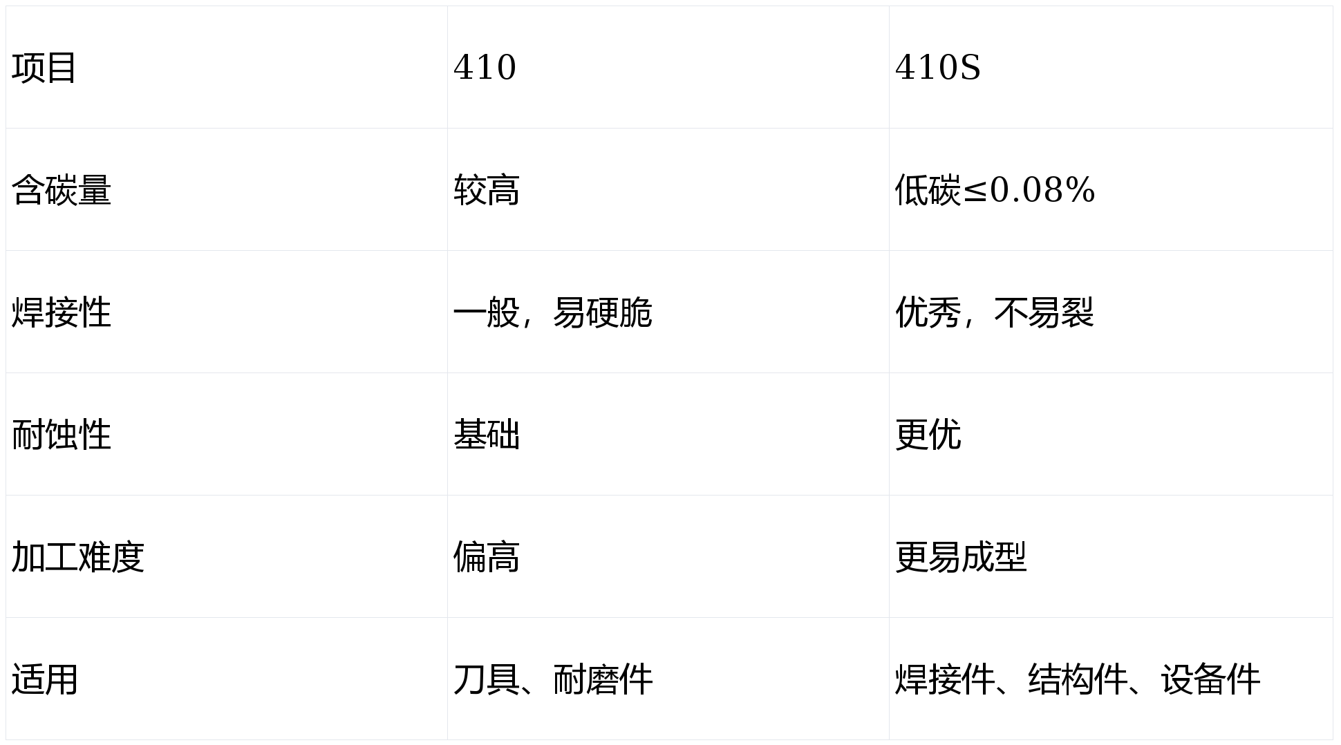 二、410S 的核心优势1. 焊接友好,不易开裂:普通 410 焊接后易硬脆、易裂;410S低碳设计,焊接后硬度低,大多可免退火使用,现场施工更稳。