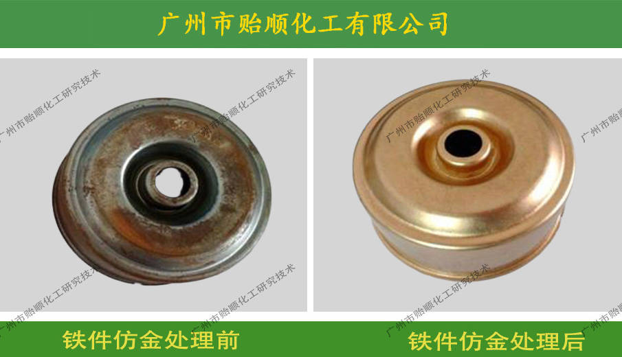 1、工件前处理先对钢铁工件进行除油、酸性除锈,再经打磨抛光,获得光亮、洁净的表面,为仿金处理打好基础。