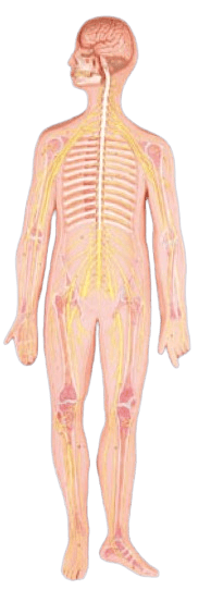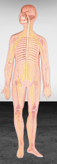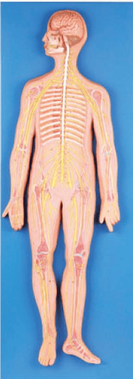 『神经系统』模型显示中枢神经脑、脊髓、周围神经等结构,包括从中枢发出到身体各部的脊神经(臂从桡神经、尺神经、正中神经、腰丛股神经骶丛坐骨神经等)等结构,共有33个部位数字指示标志及对应文字说明。