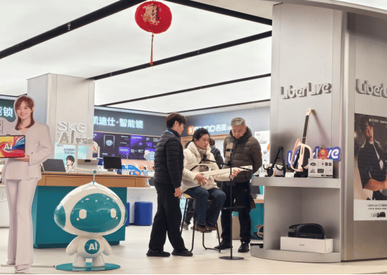 在南京新街口的Suning Max店,3C顾问用手机打开乐谱,引导李女士拨动电吉他,她的丈夫则用智能手表同步录音。琴声、歌声与笑声交织,门店一角瞬间化身“家庭录音棚”。夫妻俩笑着说:“以前逛商场都是购物吃饭,没想到现在能玩音乐,太有意思了!”
