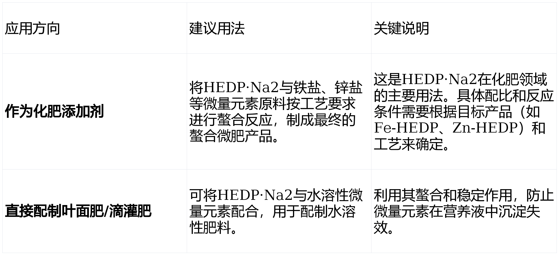 总的来说,HEDP·Na2在化肥中的角色是螯合剂和增效载体,通过其强大的络合能力,为作物提供高效、稳定的微量元素营养。
