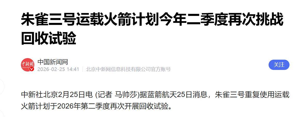 专家分析认为,在火箭一二级分离之后,火箭在距离地面80公里的高空成功点燃,并在从40公里滑行至地面3公里的过程中,气动控制系统表现得相当顺利。然而,在最后阶段,火箭进行减速着陆点火时未能成功刹车,导致火箭未能软着陆。尽管如此,火箭坠毁的位置距离预设着陆中心点仅约40米,这意味着如果最后的刹车点火操作得当,火箭本有可能顺利软着陆,甚至精确地降落在预定着陆点。 自首次发射至今,短短两个月时间,朱雀三号火箭的研制团队便取得了积极的进展。团队正在对火箭的着陆流程进行优化,计划在2026年第二季度进行第二次回收试验,力争在今年第四季度实现首次回收复用飞行。这一进展意味着,如果朱雀三号火箭在下次回收试验中成功回收,其子级将再次用于下一次发射,完成火箭的重复使用。