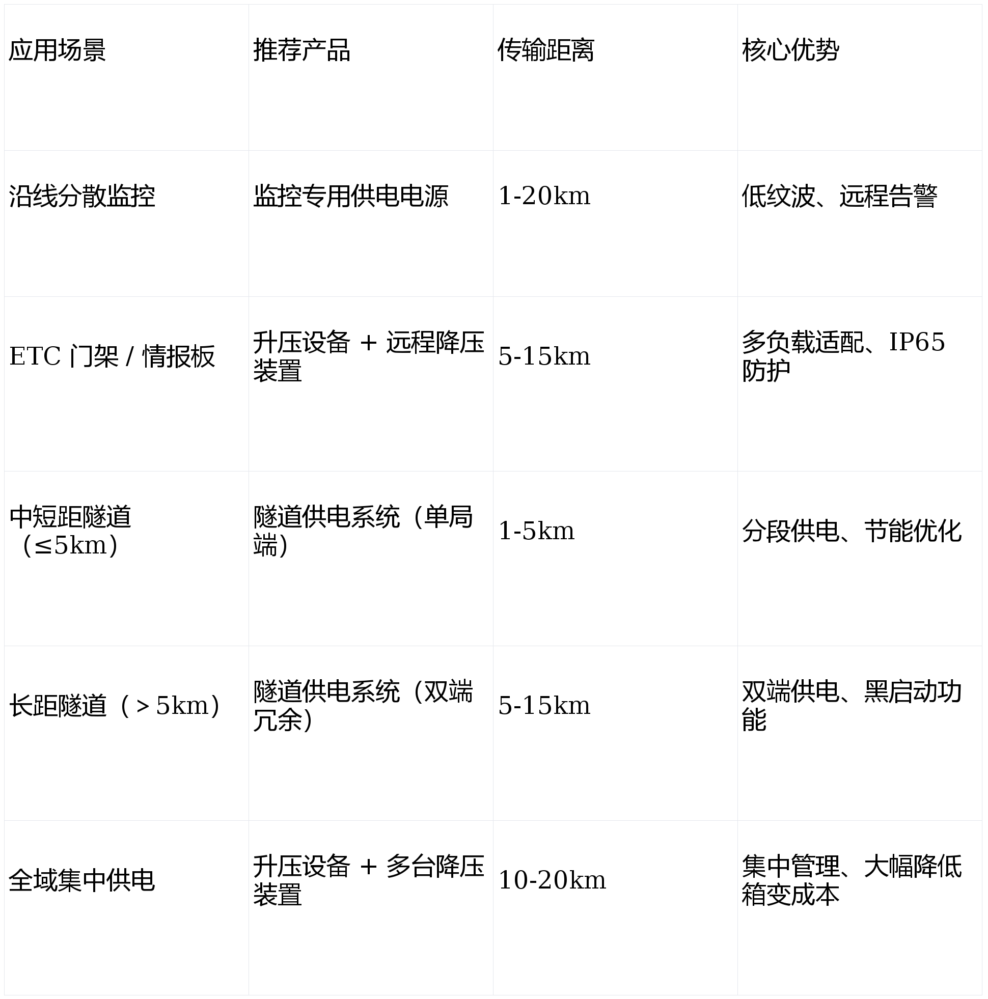 - 典型应用:ETC 门架旁、监控杆底部、隧道分区间,就近为终端设备供电