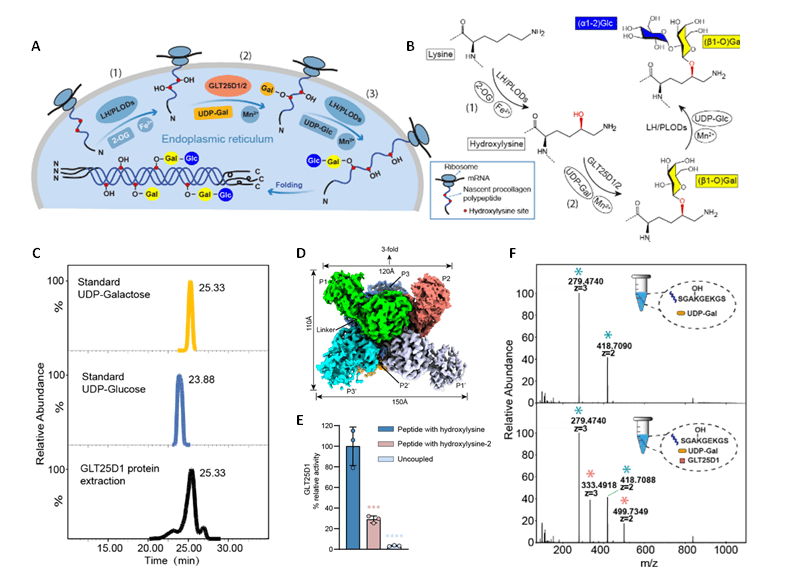 胶原蛋白是哺乳动物体内含量最多的蛋白质,占人体总蛋白量30% 以上,是细胞外基质的重要组分,主要发挥结构性作用。胶原蛋白的糖基化修饰对于其三股螺旋的组装以及在细胞外基质中的功能发挥具有重要意义。该糖基化过程发生于内质网中,其中关键的初始步骤由半乳糖基转移酶GLT25D1催化,其将半乳糖残基转移至胶原蛋白保守重复基序“Gly-Xaa-Hyl”中的羟赖氨酸位点,形成半乳糖基化羟赖氨酸。GLT25D1介导的糖基化功能异常与多种疾病的发生发展密切相关。因此深入阐明其催化机制及相关疾病的分子致病机制,能够为靶向胶原异常合成相关疾病的临床诊断与治疗奠定重要基础。