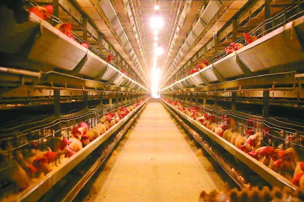 此时的鸡舍里,几台巨大的通风机持续运转,整齐排布的照明设备将房间照得通明;一只只蛋鸡站在一排排立体鸡笼里,点着头欢快地吃着“早餐”。